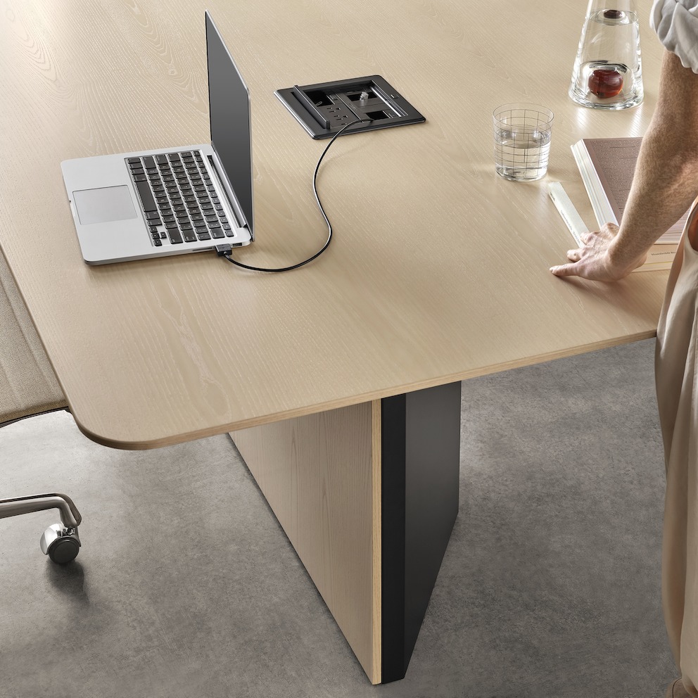 Hablamos de sensores que optimizan la iluminación y la climatización de forma automática, cargadores inalámbricos empotrados en mesas de reunión, y puntos de carga estratégicamente ubicados que eliminan el caos de los cables.
